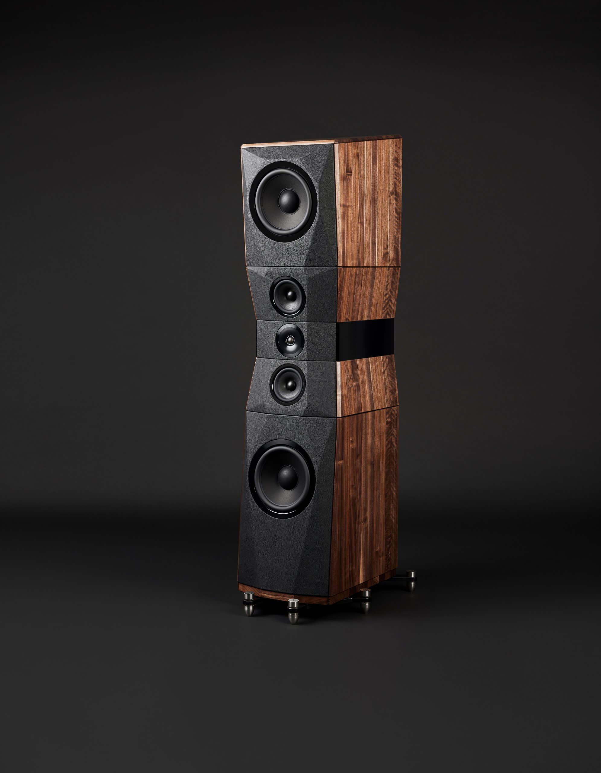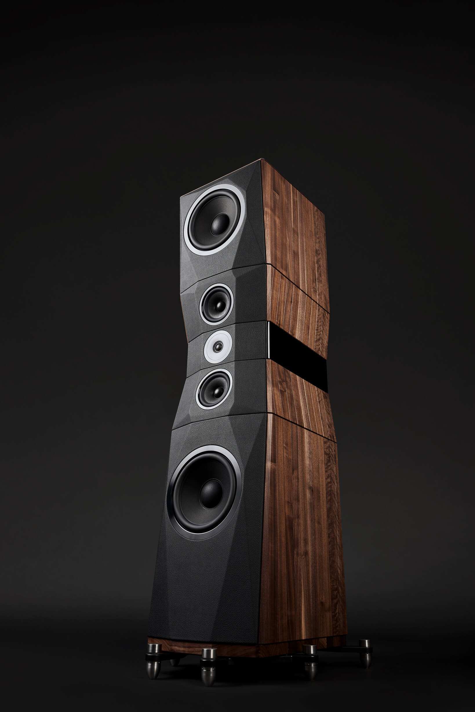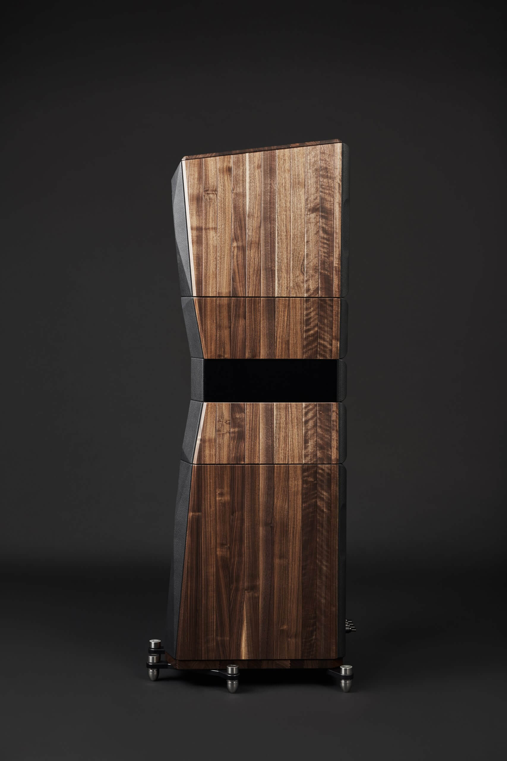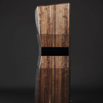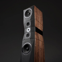 - Design D’Appolito (MTM) a 3 vie con deflettori speculari verticali, che utilizza una struttura interna segmentata con camere separate che caricano individualmente i driver e isolano il crossover, con caricamento reflex e ogni woofer dotato di una propria porta di accordo posteriore.